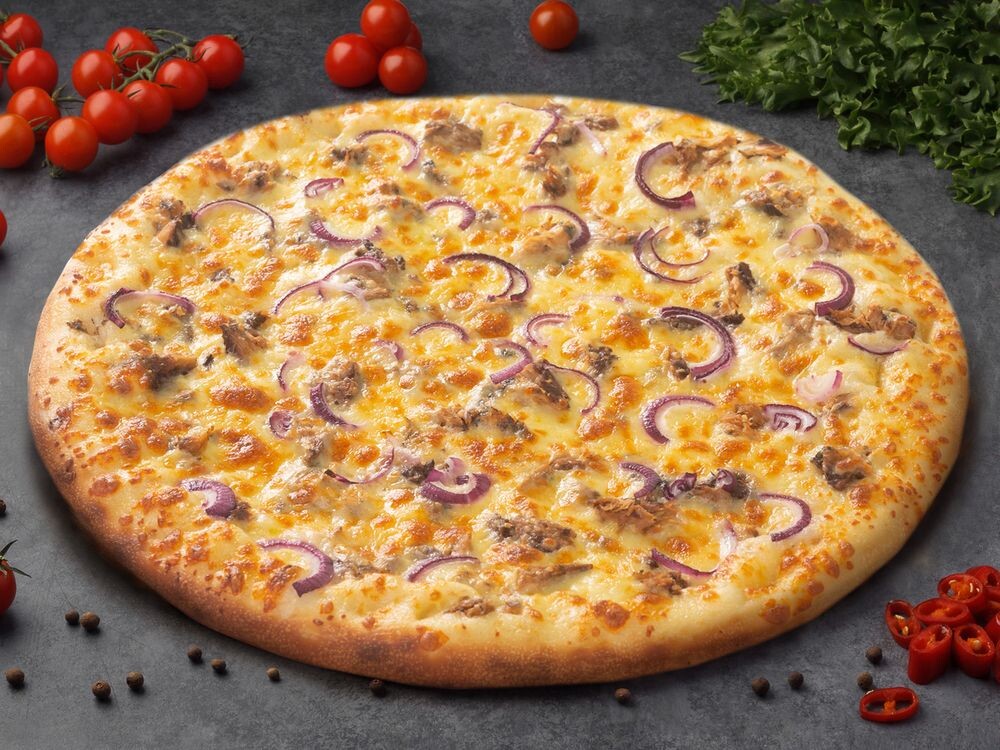 Тесто, соус томатный, тунец, лук, огурец маринованные, сыр "Моцарелла"