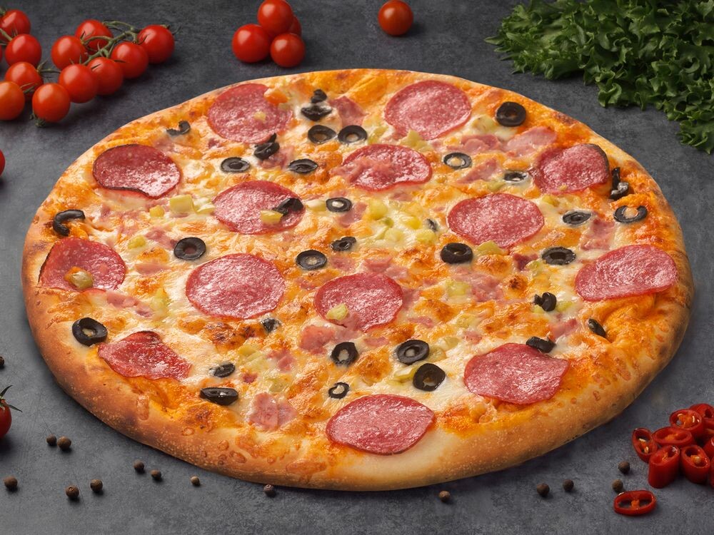 Тесто, сервелат, ветчина, перец болгарский, маслины, соус томатный, сыр "Моцарелла"