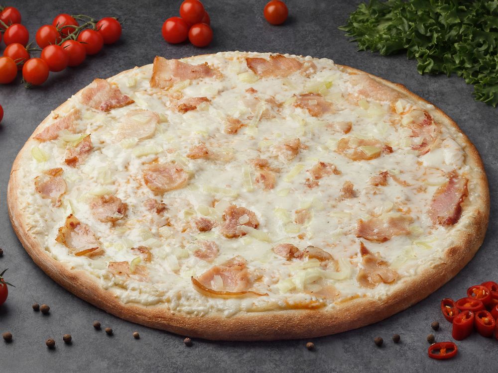 Тесто, лук маринованный, бекон, картофельное пюре, соус томатный, сыр "Моцарелла"