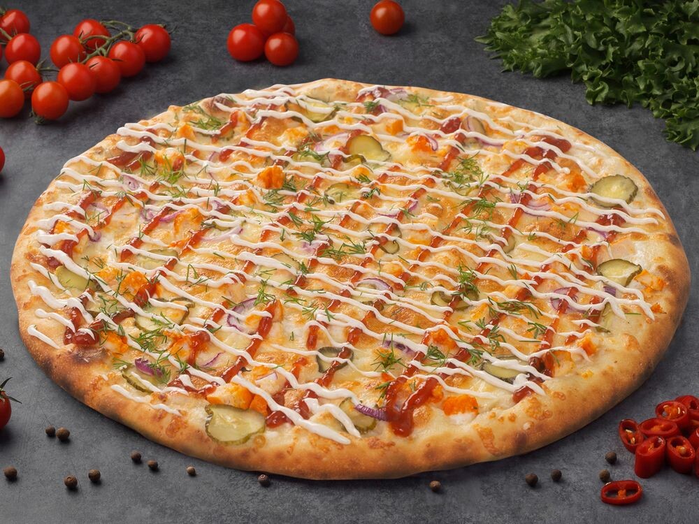 Тесто, куриное филе, лук, соус томатный, огурцы маринованные, сыр "Моцарелла"